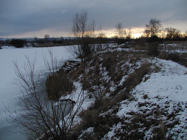 Pohled směrem ke staré části... 15:32 - 20.01.04 Voda zamrzlá, cca 3 až 5cm sněhu na ledu ( na okrajích roztál ). Současná teplota vzduchu 0°C