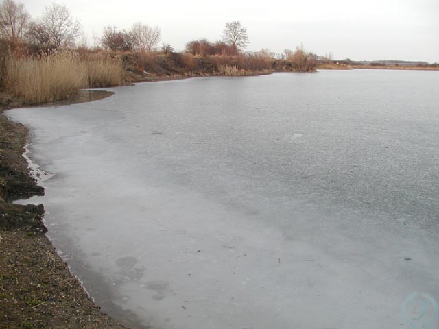 Pohled severně ze staré části. 6.2.2004 - 15:58. Led taje a je dosti křehký. Metr od kraje dosahuje cca 10 cm tloušťky. Na některých místech je však tlustý jen několik centimetrů. Vytvořit v něm otvor je v podstatě snadné. Tři až pět metrů od břehu si troufám říci, že lze led v krizové situaci zespodu prolomit. Současná teplota vzduchu 13°C.