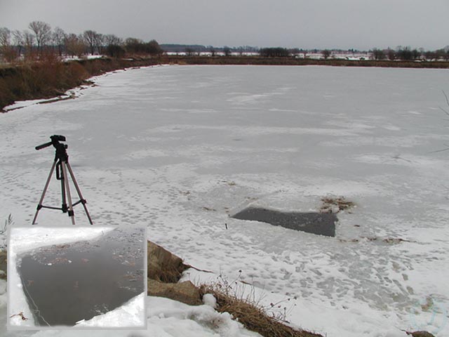 Fotografie byla pořízena 13.3.2005 v 16:00 odpoledne v sektoru A 7. Jedná se zřejmě o historicky první potápění pod ledem na této lokalitě. To též lze říci i o prvním sólo ponoru pod ledem na této lokalitě. Led silný 23 cm. Vzduch + 3°C. Voda nahoře 0°C ( měřeno lihovým teploměrem ) dole +4°C. Viditelnost byť byla očekávána větší něco málo přes 5 m. Jinak údajně super. Díra zabrala docela dost času, ale jistě to stálo zato :-) Další díra se plánuje v sektoru A 1, nebo B 1. Tedy jestli led vydrží... (J).