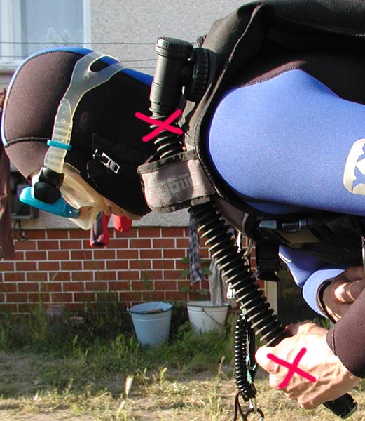 Potápěč drží chybně inflátor za gumovou hadici a ne v místě ovládacích prvků, odkud vede spojovací lanko k vypouštěcímu ventilu uvnitř vrapové hadice. Tím že potápěč táhne vrapovku dolů a směrem k tělu, dochází k ohybu hadice u ventilu a také k namáhání spoje mezi gumovou hadicí a plastovou trubkou vypouštěcího ventilu...